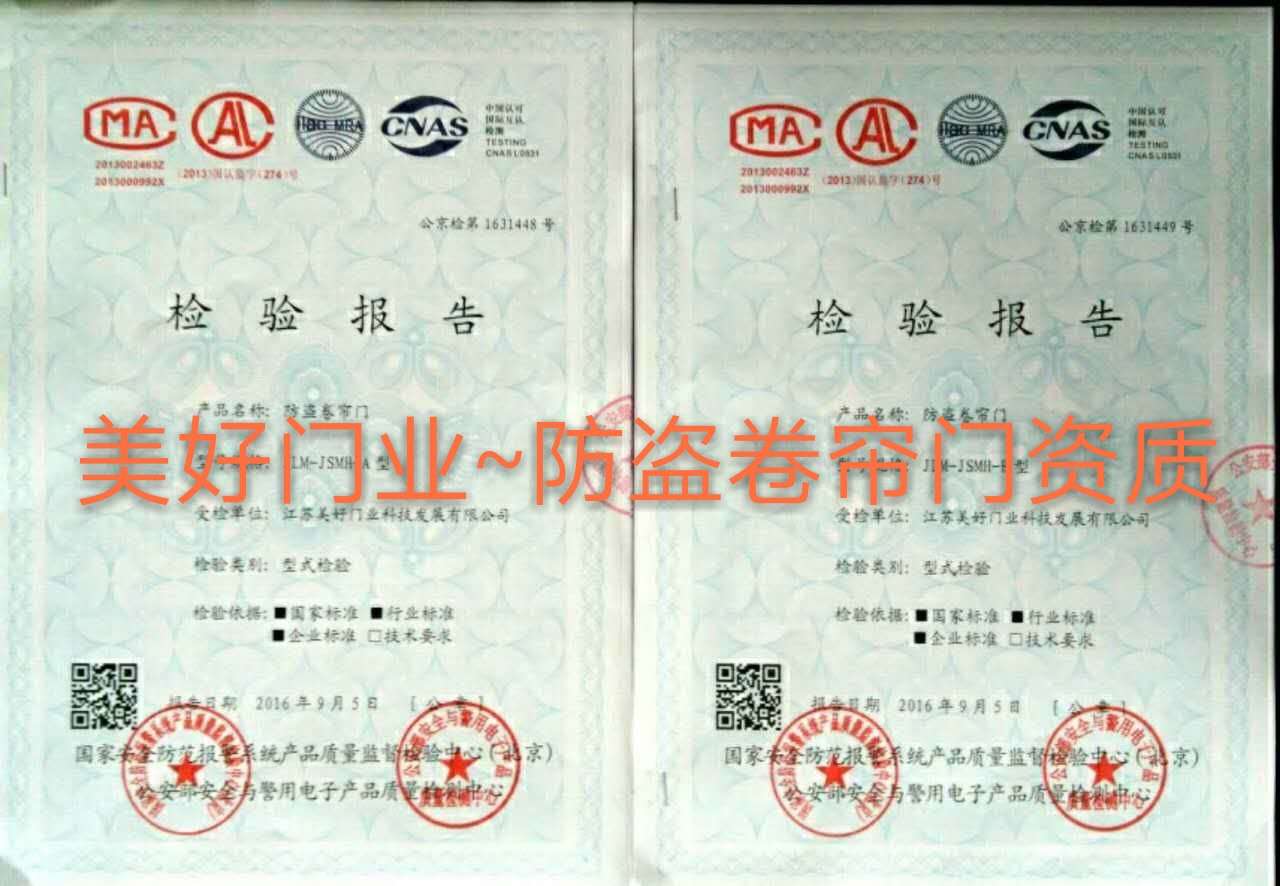 江蘇美好門業(yè)科技發(fā)展有限公司的兩款防盜卷簾門,日前通過(guò)國(guó)家安全防范報(bào)警系統(tǒng)產(chǎn)品質(zhì)量監(jiān)督檢驗(yàn)中心、公安部安全與警用電子產(chǎn)品質(zhì)量檢測(cè)中心檢測(cè),獲得防盜卷簾門型式檢測(cè)報(bào)告證書即JLM-JSMH-A型 公京檢第1631448號(hào)、JLM-JSMH-B型 公京檢第1631449號(hào),同時(shí)獲得國(guó)際互認(rèn)檢測(cè)TESTING CHASL 0531.