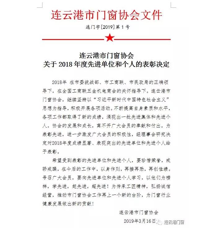 2019連云港市門窗協(xié)會(huì)表彰大會(huì)暨年度慶典3月16日下午在市區(qū)“開元曼居”酒店隆重舉行。