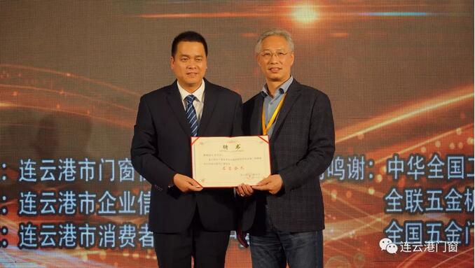 全國(guó)工商聯(lián)五金機(jī)電商會(huì)建筑門窗委員會(huì)會(huì)長(zhǎng)王辛先生為獲獎(jiǎng)個(gè)人頒發(fā)“卓越功勛”獎(jiǎng)
