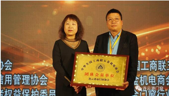 全國(guó)工商聯(lián)五金機(jī)電商會(huì)產(chǎn)業(yè)發(fā)展部主任、建筑門窗委員會(huì)秘書長(zhǎng)張秀梅女士向連云港市門窗協(xié)會(huì)秘書長(zhǎng)胡啟楷頒發(fā)“團(tuán)體會(huì)員單位”銅牌。