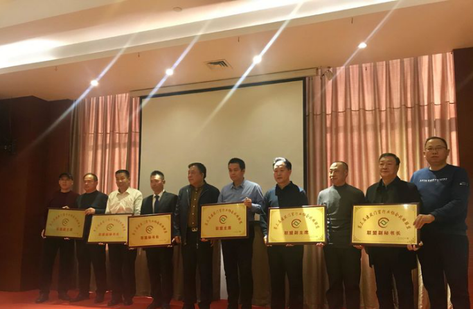 門窗聯(lián)盟新任主席潘國柱為新加入聯(lián)盟的商協(xié)會(huì)代表授牌。