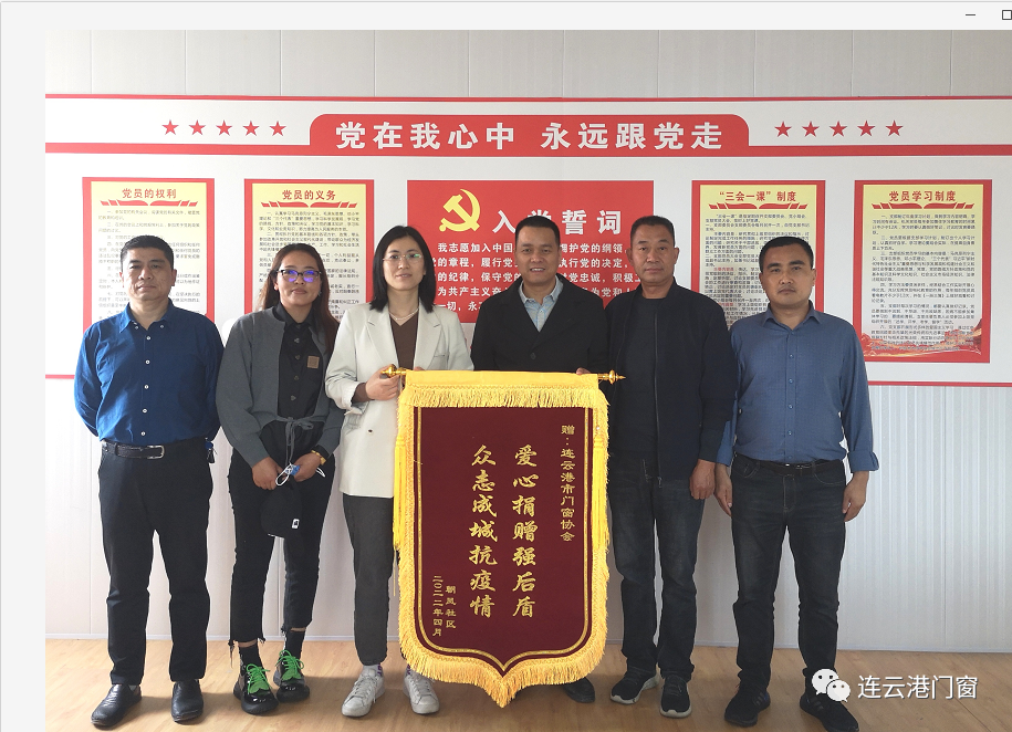 5月11日海州區(qū)南城街道周書記攜街道朝鳳社區(qū)的江書記來到市門窗協(xié)會(huì)黨支部,為我會(huì)送來一面內(nèi)容為“愛心捐贈(zèng)強(qiáng)后盾,眾志成城抗疫情”的錦旗,對(duì)我會(huì)會(huì)員在疫情期間聯(lián)合朝鳳社區(qū)抗擊疫情、捐獻(xiàn)物資助力一線防疫人員的善舉表示感謝!