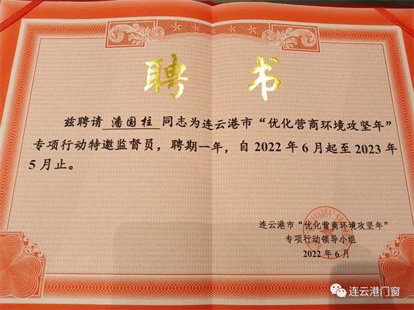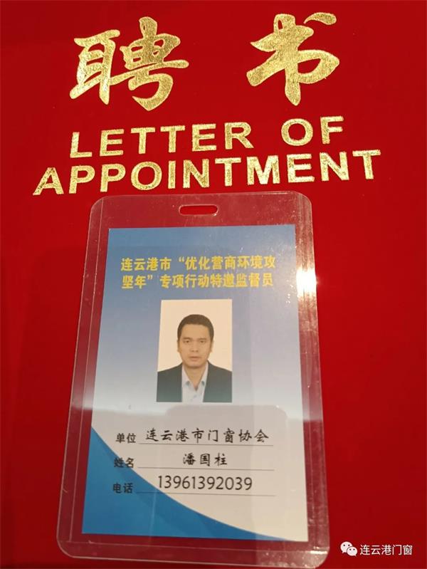 ? ??會(huì)上連云港市門(mén)窗協(xié)會(huì)黨支部書(shū)記、會(huì)長(zhǎng)(江蘇美好門(mén)業(yè)科技發(fā)展有限公司董事長(zhǎng))潘國(guó)柱被聘任為市“優(yōu)化營(yíng)商環(huán)境攻堅(jiān)年”專(zhuān)項(xiàng)行動(dòng)特邀監(jiān)督員。