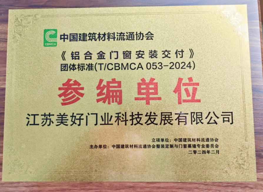 江蘇美好門業(yè)科技發(fā)展有限公司《鋁合金門窗安裝交付》標(biāo)準(zhǔn)參編證書