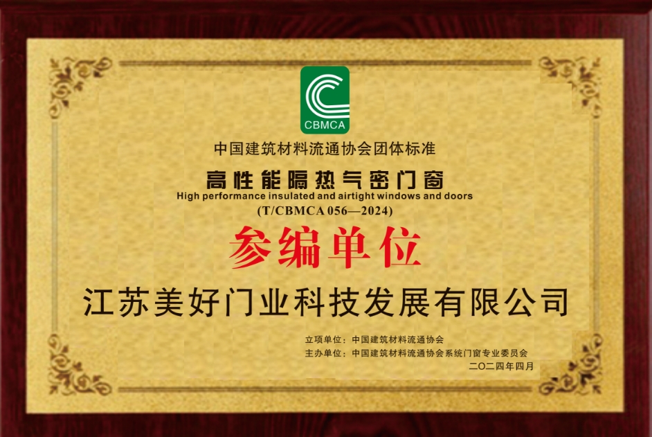 江蘇美好門業(yè)科技發(fā)展有限公司《 高性能隔熱氣密門窗》標(biāo)準(zhǔn)參編證書